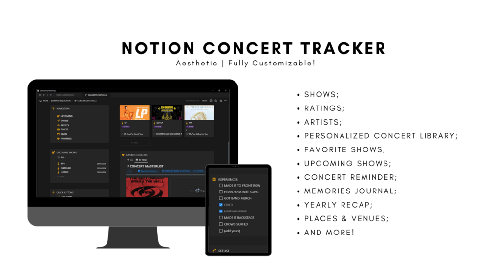 Relive the magic of every concert moment with the TFNY - Notion Concert Tracker. Whether you're a seasoned concert-goer or a music enthusiast looking to discover new artists, this innovative digital tracker is designed to enhance your concert-going experience like never before.
