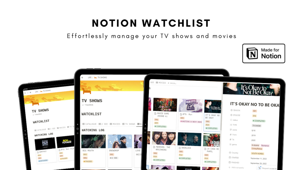 Effortlessly manage your TV shows and movies. This template can assist in organizing and tracking content like movies, series, or animes you want to watch. It helps manage and keep track of what you're interested in watching.